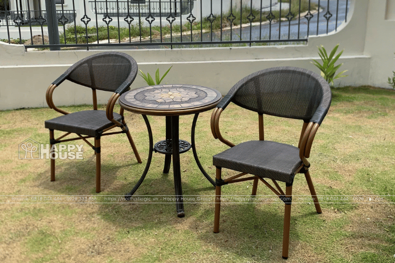 Chọn các loại bàn ghế có khung kim loại chống rỉ hoặc gỗ đã xử lý chống ẩm mốc, đồng thời có khả năng chịu nắng mưa tốt như nhôm đúc hoặc sắt sơn tĩnh điện.