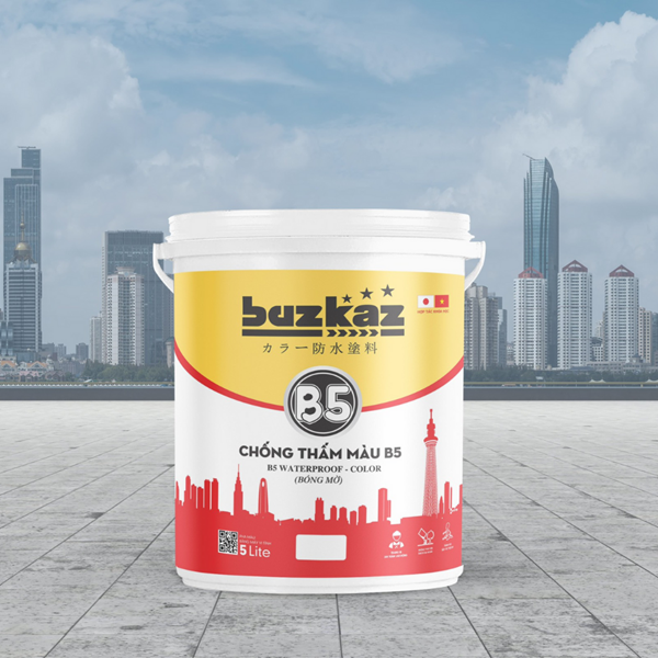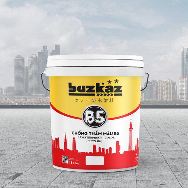 BUZKAZ B5 (Ngăn ngừa nước tối ưu - không cần sơn lót) là sơn chống thấm cao cấp gốc nước. Sử dụng để ngăn chặn sự thấm nước từ bên ngoài vào, đặc biệt là vách tường đứng. BUZKAZ B5 tạo nên màng sơn đàn hồi tốt trong thời gian dài, bền màu, kháng kiềm và nấm mốc rất tốt, dễ dàng chùi rửa, tương thích với các loại sơn khác. BUZKAZ B5 thể phủ lấp các vết rạn nứt và khe hở nhỏ trên bề mặt bê tông